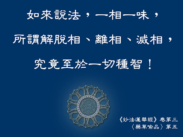 這些種種法門無論橫說、豎說,各種說法,總是趣向於同一個法味,同是遠離味、同是解脫味、同是寂滅味,所以以這些法味,佛無論用什麼方法來顯示這個法門,目標都不會離開一相一味的真理。